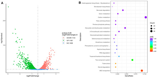 The transcriptome profile of M. tuberculosis cocultured with or without RTD treatment. (A) Volcano plot of genes with |log2FoldChange| > 0 and p < 0.05; (B) KEGG analysis of gene descriptions.