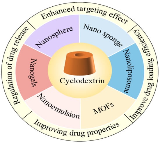 This review summarizes these innovations, with a special focus on the study of applications of CDs and their derivatives in nano-delivery systems. By covering areas such as nanospheres, nano-sponges, nanogels, CD metal–organic frameworks, liposomes, and emulsions, this review will delve into the properties of these materials as carriers and their potential applications in nano-delivery systems. This comprehensive and in-depth understanding will provide comprehensive support for the design and development of nano-delivery systems and will promote the further innovation and application of nanotechnology in biomedicine, drug delivery, and other fields. In this dynamic area of research, this review focuses on the applications of CDs and their derivatives and the prospects that they bring, providing readers with a starting point to learn more. Figure 1 summarizes the advances of CDs and their derivatives in nano-delivery systems.