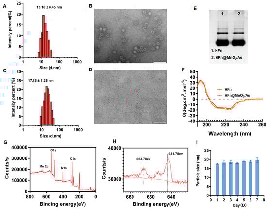 Finally, we performed a relevant characterization of the prepared nanoparticles. The hydrodynamic particle sizes, zeta-potentials, and polydispersity index (PDI) of HFn and HFn@MnO2/AS nanoparticles were measured using a Malvern Nano ZS 90 (Malvern Instruments Ltd., Malvern, UK). The morphology of the HFn and HFn@MnO2/AS nanoparticles was detected using transmission electron microscopy (TEM, JEOL, Tokyo, Japan). The concentration of the encapsulated AS was measured using high-performance liquid chromatography equipped with an ELDS detector (HPLC-ELDS) and a C18 column. For AS, the mobile phase was Acetonitrile: Water (45:55, v/v). A total of 20 μL of sample solution was injected and run at a flow rate of 1.0 mL/min. The structural stability of HFn before and after the preparation of HFn@MnO2/AS nanoparticles was confirmed using native polyacrylamide gel electrophoresis (native PAGE) and circular dichroism (CD) spectroscopy. The particle size of HFn@MnO2/AS nanoparticles in a PBS solution containing 10% serum was detected using DLS after being stored at 4 °C for 7 days.
