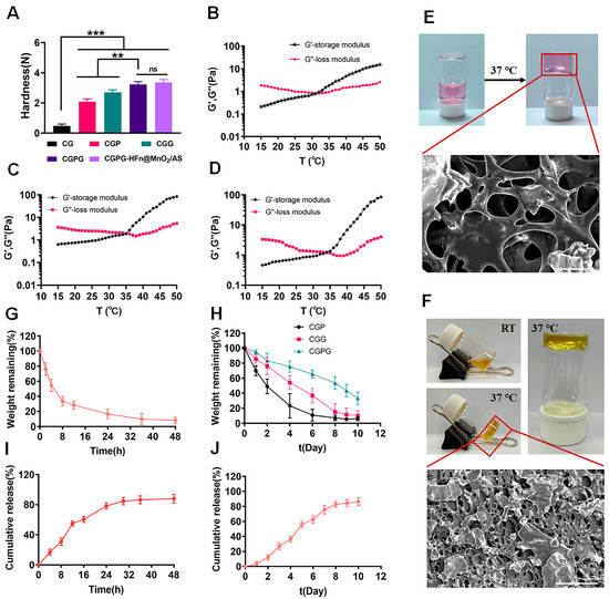 (A) The mechanical properties of CS, CGP, CGG, CGPG, and CGPG-HFn@MnO2/AS hydrogels. n = 3, ** p < 0.01, *** p < 0.001. Rheological G′ and G″ against temperatures of GC (B), GCPC (C), and GCPC-HFn@MnO2/AS (D) hydrogels. (E) The gel formation image of blank hydrogels at 37 °C and the SEM micrograph of blank CGPG hydrogels (Scale bar: 50 μm). (F) The gel formation image of CGPG-HFn@MnO2/AS hydrogels at 37 °C and the SEM micrograph of CGPG-HFn@MnO2/AS hydrogels (Scale bar: 200 μm). (G) The in vitro degradation analysis of GC hydrogels. (H) The in vitro degradation analysis of CGP, CGG, and CGPG hydrogels. (I) The in vitro cumulative release of AS from HFn@MnO2/AS nanoparticles. (J) The in vitro cumulative release of AS from CGPG-HFn@MnO2/AS hydrogels.