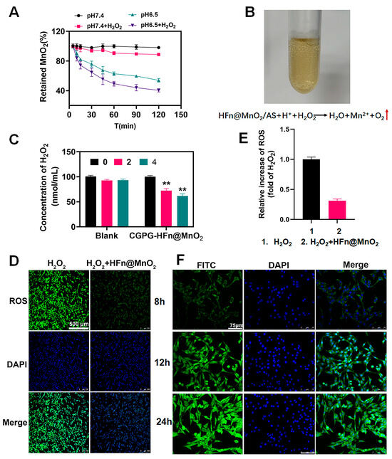 (A) The degradation behavior of HFn@MnO2 incubated in different pH solutions (pH 7.4 and 6.5) with or without H2O2. (B) O2-bubbles image observed after incubation with H2O2 in an acidic condition to confirm the formation of MnO2. (C) Evaluation of in vitro antioxidant effects of blank CGPG hydrogels and CGPG-HFn@MnO2/AS hydrogels in the absence of cells; ** p < 0.01. (D) Evaluation of antioxidant effects of HFn@MnO2/AS in PC12 cells after being stimulated by H2O2 (Scale bar: 500 μm) (E) Analysis of the ROS fluorescence intensity according to section D by Image J (version v1.53t). (F) Cellular uptake of FITC-HFn@MnO2/AS in CGPG hydrogels by PC12 cells detected by CLSM after incubation for 8, 12, and 24 h. (Scale bar: 75 μm).
