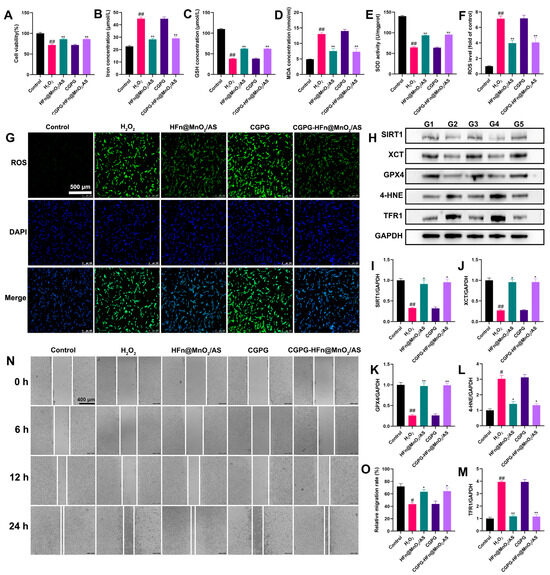Effects of CGPG-HFn@MnO2/AS on H2O2-treated PC12 cells. (A) Cell viability was detected using the CCK-8 assay kit. (B) Cellular iron levels were detected using a kit. (C) Cellular GSH levels were detected using a kit. (D) Cellular MDA levels were detected using a kit. (E) Cellular SOD activity was detected using a kit. (F,G) Cellular ROS levels were detected using the fluorescent probe DCFH-DA. (Scale bar of G: 500 μm) (H–M) The protein levels of SIRT1, XCT, GPX4, 4-HNE, and TFR1 were detected by western blot assay. G1: control group. G2: H2O2 group. G3: HFn@MnO2/AS group. G4:CGPG group. G5: CGPG-HFn@MnO2/AS. (N,O) Cell migration was evaluated using the wound healing assay. (Scale bar of N: 400 μm)Statistical analyses were performed using a one-way analysis of variance (ANOVA), followed by Tukey’s post-hoc test (n ≥ 3). # p < 0.05 and ## p < 0.01 vs. the control group; * p < 0.05 and ** p < 0.01 vs. the H2O2 group.
