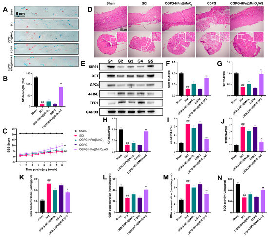 Effects of CGPG-HFn@MnO2/AS on rats undergoing SCI. (A,B) The hind-limb motor function recovery of SCI rats was evaluated using footprint analysis. ## p < 0.01 vs. the control group; ** p < 0.01 vs. the SCI group. (C) The degree of hind-limb recovery was evaluated by the BBB score. ## p < 0.01 vs. the sham group; ** p < 0.01 vs. the SCI group. (D) The histological lesion was evaluated using H&E staining. (E–J) The protein levels of SIRT1, XCT, GPX4, 4-HNE, and TFR1 were detected using a western blot assay. G1: sham group. G2: SCI group. G3: CGPG-HFn@MnO2/AS group. G4:CGPG group. G5: CGPG-HFn@MnO2/AS. (K) The level of iron in the spinal cord was detected using a kit. (L) The level of GSH in the spinal cord was detected using a kit. (M) The level of MDA in the spinal cord was detected using a kit. (N) The activity of SOD in the spinal cord was detected using a kit. Statistical analyses were performed using a one-way analysis of variance (ANOVA), followed by Tukey’s post-hoc test (n ≥ 3). ## p < 0.01 vs. the sham group; * p < 0.05 and ** p < 0.01 vs. the SCI group.