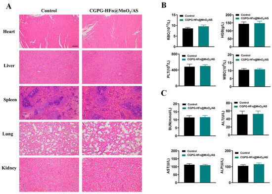 To comprehensively evaluate the in vivo safety of CGPG-HFn@MnO2/AS hydrogels, H&E staining was performed on the heart, liver, spleen, kidney, and lung tissues obtained from healthy SD rats after administration of nanoparticles. Figure 6A shows the comparison of the H&E staining results between rats in the control and treatment groups. It was worth noting that no obvious pathological changes in morphology were found in the examination of all organs. In addition, blood samples were collected for hematological and serum biochemical analysis. As shown in Figure 6B, the results of hematological analysis showed that there were no significant differences in the concentrations of WBCs, RBCs, HGBs, and PLTs between the groups, all of which were within the normal physiological range. In addition, the biochemical analysis in Figure 6C showed that the levels of BUN, AST, ALT, and ALP in all groups were within the normal range, and there were no significant differences between the treatment groups. Therefore, the above results indicated that CGPG-HFn@MnO2/AS hydrogels had good safety.