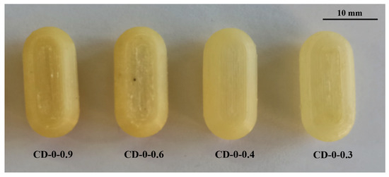 In the realm of personalized pharmacy, achieving precision and accuracy is a constant pursuit. For that reason, the manipulation of printing parameters becomes crucial in ensuring the production of flawless final products such as 3D printing CDs [38]. The CD printing process began with the printing of CD-0-0.9, inspired by the findings of our previous work [26]. CD-0-0.9 served as a solid base for printing thinner w. As shown in Table 2, for CD-0-0.9, it was necessary to increase F from the initial setting of 100% to 170% at layers 64 to 69 and to 150% at layers 70 to 75 to achieve a proper seal between the CD body and cover. V was also adjusted among the layers to achieve successful prints. Reducing this parameter allowed a smooth deposition of material on the layers, resulting in the complete closure of the CDs. Consequently, V was decreasing at layers 64 to 66 from 1200 to 250 mm/min, at layers 67 to 100 mm/min, and at layers 68 to 75 to 250 mm/min. This modification allowed optimum adhesion between the body and cover. This CD design (CD-0-0.9) achieved a PE of 100%. Nonetheless, as w decreased, it became more challenging to obtain a completely closed and flawless print. Hence, it was necessary to change some printing parameters. For all CD-0-0.6, CD-0-0.4, and CD-0-0.3 designs, it was necessary to modify Text with respect to CD-0-0.9. This parameter was increased from 190 °C to 200 °C after manual drug filling (i.e., layers 64 to 75). For DC-0-0.6, despite Text, no changes were made to the printing parameters compared to CD-0-0.9, achieving a PE of 100%. Although the CD-0-0.4 did not show any changes in F and V compared to CD-0-0.9, a change in the nozzle diameter (Nd from 0.4 mm to 0.2 mm) was required to print a thinner w without imperfections. This design achieved a PE of 85%. Regarding CD-0-0.3, it was also printed using an Nd of 0.2 mm. Although closed CD-0-0.3 was able to be obtained for physical and biopharmaceutical analysis, the PE was less than 20% (i.e., 80% of CD-0-0.3 failed during the printing process). Furthermore, various efforts were made to print the CD-0-0.2. Twenty-two different sets of printing parameters were tested, adjusting F, V, and Text to obtain a successful print. Nonetheless, failures were observed in all the CDs. To counteract the problems of adhesion to the printing platform for the first layers, F was increased from 100 to 180%, resulting in a more robust base, albeit still presenting failures in the subsequent layers (Figure 3b(I),c(I)). For the final layers of the cover, even if different F settings were tested (between 170 and 300%), cracks and adhesion problems were unsolved (Figure 3a(II),b(II),c(II)). In some cases, the cover was not completely closed due to bridging failure, resulting in unwanted gaps (Figure 3a(III),c(III)). In additive manufacturing, bridging the printing of a cantilevered part of the 3D-printed object is a particularly challenging process [39]. It should be noted that although changes were made to address the above-mentioned failures in the critical areas, it was not possible to solve the problems consistently. Finally, based on the aforementioned results, design CD-0-0.4 was considered as the CD with the thinner w able to be printed. Figure 4 shows the printed CD-0 arranged in order of decreasing w (i.e., CD-0-0.9, CD-0-0.6, CD-0-0.4, and CD-0-0.3). Each CD is an identical replica of the next, emphasizing the precision of the printing process in reproducing the same dimensions.