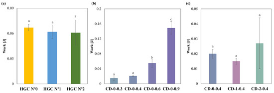 Figure 6. Compression work of (a) HGCs, (b) CDs of different w, and (c) CDs of different sizes (columns with the same letters indicate no significant difference among the compression work of the samples).
