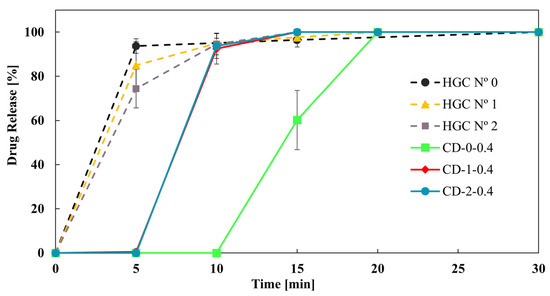 Table 4 shows the DT values of HGCs and CDs of different w and sizes. As can be seen, both HGCs and CDs exhibited DT values lower than 30 min (1800 s), meeting the requirement for immediate-release solid oral dosage forms [32]. Particularly, we observed that the DT of the CDs were longer than those of the HGCs (Table 4). The DT increased with w, which is expected since it increases the CD’s structural integrity. PVA is a water-soluble polymer that erodes into a physical hydrogel [25]. Indeed, the additional wall material may provide greater resistance to external forces due to a more viscous hydrogel formation, giving longer DTs. In relation to size, CD-0-0.4 showed the longest DT while DT for CD-2-0.4 was longer than for CD-1-0.4. In fact, DT for CD-2-0.4 and CD-1-0.4 present no significant differences (p > 0.05). This indicates that the effect of size is important for the biggest CDs, which are more difficult to erode (i.e., longer DT).