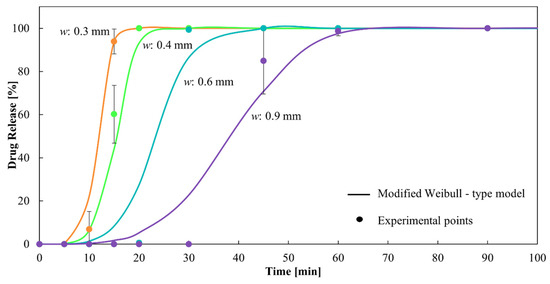 Figure 10. Dissolution profiles of CDs of different wall thicknesses from the modified Weibull-type model and experimental points.