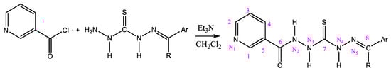 - Thomas, A.B.; Nanda, R.K.; Kothapalli, L.P.; Deshpande, A.D. Synthesis and antimicrobial activity of N-[2-(aryl/substituted aryl)-4-oxo-1,3-thiazolidin-3-yl]pyridine-4-carboxamide. J. Kor. Chem. Soc. 2011, 55, 960–968. [Google Scholar] [CrossRef]