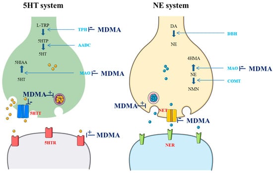 Effects of MDMA on the 5HT and NE system (drawn in part using images from Servier Medical Art. Servier Medical Art by Servier is licensed under a Creative Commons Attribution 3.0 Unported License (https://creativecommons.org/licenses/by/3.0/; accessed 8 August 2024); L-TRP: L-tryptophan; TPH: L-tryptophan hydroxylase; 5HTP: 5-hydroxytryptophan; AADC: L-aromatic amino acid decarboxylase; 5HT: serotonin; MAO: monoamine oxidase; 5HIAA: 5-hydroxyindoleacetic acid; 5HTT: 5HT transporter; 5HTR: 5HT receptor; DA: dopamine; DBH: dopamine beta-hydroxylase; COMT: catechol; NE: norepinephrine; 4HMA: 4-hydroxymandelic acid; NMN: normetanephrine; NET: NE transporter; NER: NE receptor).
