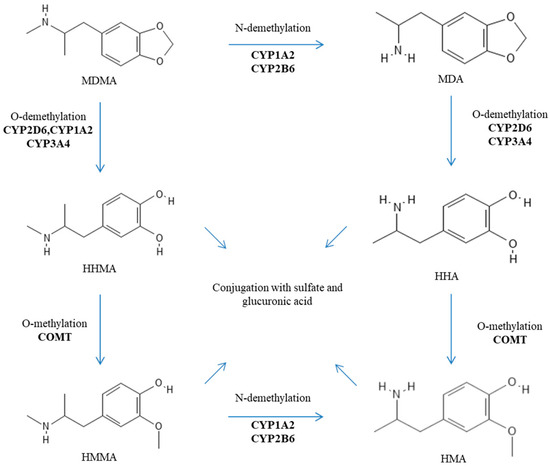 After oral administration, MDMA is rapidly absorbed into the bloodstream (with a Tmax of about 2 h), and its transport is not mediated by P-glycoprotein (also known as MDR1 or ABCB1) [8,9]. MDMA is characterized by nonlinear pharmacokinetics (PK). This nonlinear PK is observed within the normal dosing range and becomes more pronounced at higher, and potentially toxic, doses. Indeed, De la Torre et al. reported nondose-proportional area under the curve (AUC) values for oral doses of 50, 75, 100, 125, and 150 mg, which were 9.15, 17.8, 18.5, 21, and 34.5, respectively [10]. Furthermore, its metabolism is rather complex and includes two main metabolic pathways: (i) O-demethylation to 3,4-dihydroxymethamphetamine (HHMA) followed by conversion to 4-hydroxy-3-methoxyamphetamine (HMA) after several additional steps; and (ii) N-demethylation to 3,4-methylenedioxyamphetamine (MDA) before ending up as HMA [2,3]. MDMA metabolites are eventually excreted in urine as conjugated glucuronide and/or sulfate metabolites [2,3]. These processes appear rather stereoselective with a preference for S-stereoisomers and depend on several enzymes including catechol-O-methyltransferase (COMT), cytochromes P450 (CYPs) (especially the isoforms 2D6, 2B6, 2C19, 3A4, and 1A2), glutathione S-transferase (SULT), and diphospho (UDP)-glucuronosyltransferase (UGT) [4,11,12,13]. The metabolic pathways of MDMA are reported in Figure 2. It is important to note that MDA, HHMA, and HMA are pharmacologically active metabolites [4,11,12,13]. In addition, HHMA (and to a minor extent HHA) can undergo further oxidation to orthoquinones, which, when conjugated to glutathione, display cytotoxicity and contribute to cell apoptosis [4,14,15]. Detoxification of such oxidized metabolites is dependent on glutathione S-transferases (GSTs) [13].