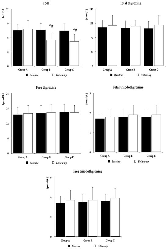 The percentage changes from baseline in glucose, HOMA-IR, HbA1c, TSH, and Jostel’s index were more pronounced in groups B and C than in group A (Table 3).