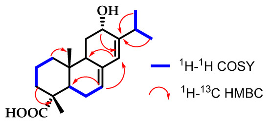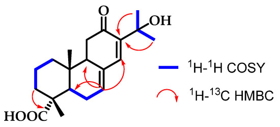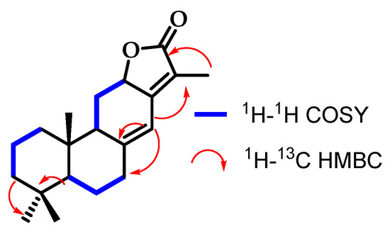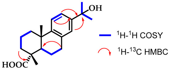 When analysing the NMR spectra, we can determine that compounds 1 and 2 are abietane-type diterpenes, as they possess two endocyclic double bonds at positions C7-C8 and C13-C14. The locations of these double bonds were established using HMBC spectra (3JH,C), which showed correlations between H-7 and C-5, C-9, and C-14; and between H-14 and C-7, C-9, and C-15. However, the difference between compounds 1 and 2 lies in the substitutions at positions C-12 and C-15.
