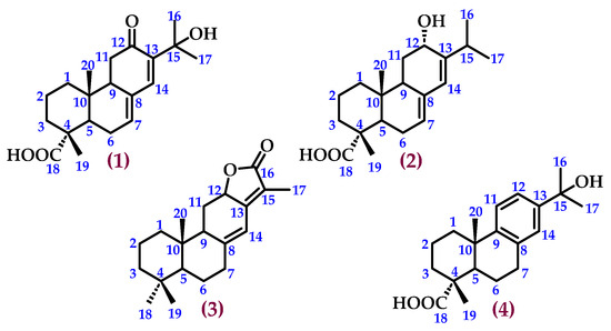 Once the compounds were characterised and analysed, they were identified as 15-Hydroxy-12-oxo-abietic acid (1); 12α-Hydroxyabietic acid (2); (−)-Jolkinolide E (3); and 15-Hydroxydehydroabietic acid (4) (Figure 5).
