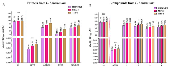 CC50s of the WST-1 (Viability) assays calculated for the extracts (A) and compounds (B) of C. bolivianum at 24 h. (−) = negative control; ACTD = Actinomycin D (positive control); AQECB = aqueous extract of C. bolivianum; HECB = n-hexane extract of C. bolivianum; and DCMECB = dichloromethane/methanol extract of C. bolivianum; (###) = Low cytotoxicity and (***) = High cytotoxicity. Viability CC50 values are the mean of three independent assays.