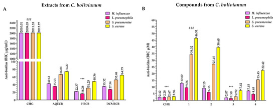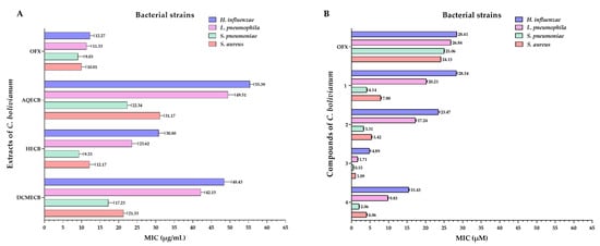 All C. bolivianum extracts exhibited antibacterial activity against Gram-negative bacteria, but they were not better than those obtained by the OFX, which had MIC values of 12.27 μg/mL for H. influenzae and 11.33 μg/mL for L. pneumophila (Figure 7A).