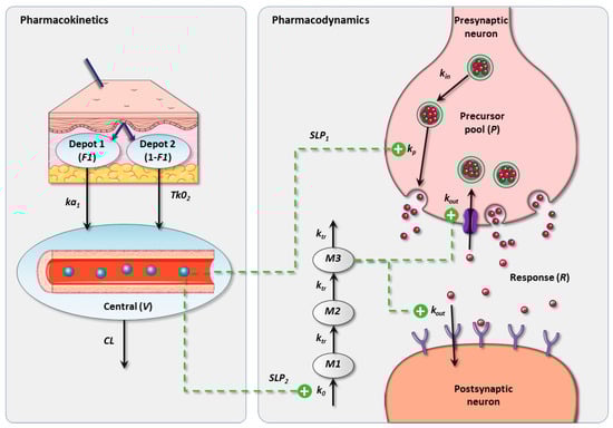 The study and the development of the present PK–PD model had a few limitations. Due to the study design conditions, longitudinal profiles were constructed from different rats, leading to an IAV and residual error increase. Moreover, no covariates (body weight, age, breed, or sex) were statistically significantly different on PK or PD parameters in order to explain the large IAV, except the brain region on kin, due to the low variation of these covariates among animals. Additionally, although the proposed model explains the longitudinal pattern of MAs, the methodology of dissection and homogenization of areas of interest for counting MAs does not allow us to verify whether the measured MAs are found in the presynaptic or postsynaptic neuron or in the synaptic cleft. In vivo studies would be necessary to corroborate the model. Finally, further studies are necessary to assess whether this model can be translated into clinical conditions.