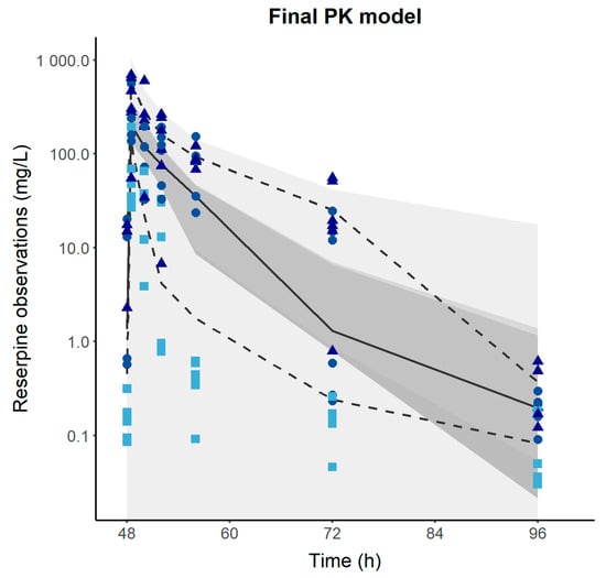 Pharmacometrics represents an essential strategy to quantitatively characterize longitudinal pharmacokinetic (PK) and pharmacodynamic (PD) relationships with drug exposure and effect variability by integrating large, complex, and heterogeneous information, allowing a more efficient and optimal model-informed drug discovery and development process. This method allows working with sparse sampling designs with few data points per subject [22]. Therefore, this strategy perfectly contributes to a more efficient and informed drug discovery and development process together with the “3 Rs” principle (replacement, reduction, refinement), which has been highly endorsed by research and regulatory authorities in recent years [23,24,25]. They provide more accurate efficacy and safety estimates by differentiating disease changes over time from changes caused by the treatment [26,27]. Recently, disease models have been published [28,29,30,31,32,33,34], but a quantitative framework able to characterize and explore disease dynamics for FMS is still lacking. Therefore, the aims of this study were (i) to develop a population pharmacokinetic model able to characterize the time course of reserpine in rats, and (ii) to establish a population PK–PD model in rats by linking the impact of reserpine on dopamine, norepinephrine, and serotonin longitudinally in different brain regions in order to quantitatively characterize the RIM model.