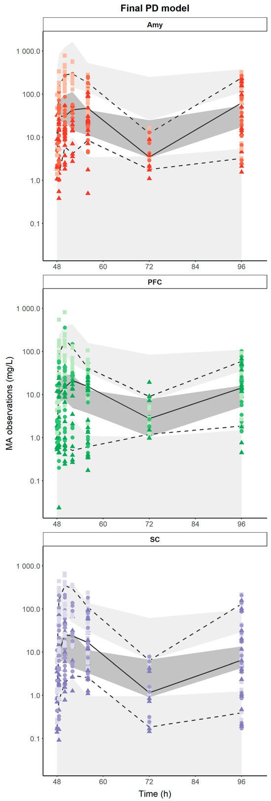 Covariates were tested on the PK–PD model, which consisted of the brain area and the type of MA. A comparison of final parameter estimates was conducted after the addition of each covariate vs. the base model. The covariate was retained if a statistically significant reduction in the OFV was observed (p-value < 0.05). This step was repeated until the inclusion of other covariates was not statistically significant.