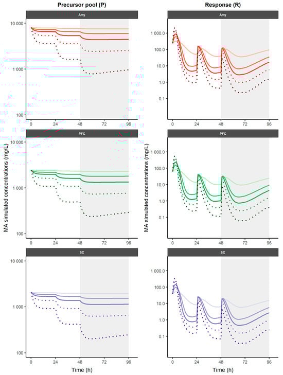 Simulation of time-course profiles on different nervous tissues obtained using PK–PD model for neurotransmitters after different reserpine dosage regimens. Experimental doses are represented as solid lines, additional simulated doses are represented as dotted lines. A gradual increase in color intensity represents the level of dose considered (0.5 to 4 mg/kg). Shaded areas represent the study period in the experimental protocol. MA: monoamine; AMY: amygdala; PFC: prefrontal cortex; SC: spinal cord.