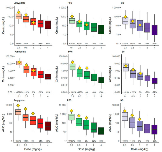 The numerical predictive check for Cmax, Cmin, and AUC is displayed in Figure 4. Regarding the reference dose (1 mg/kg) of the RIM model, the administration of 2 mg/kg would provide a median reduction of 44%, 39%, and 39% (Cmax), 59%, 58%, and 58% (Cmin) and 54%, 62%, and 49% (AUC), whereas 4 mg/kg would lead to a median reduction of 60%, 73%, and 63% (Cmax), 85%, 78%, and 77% (Cmin), and 79%, 80%, and 52% (AUC) across AMY, PFC, and SC, respectively. The results show a proportional reduction between 1 and 2 mg/kg, but a less than proportional reduction between 2 and 4 mg/kg, which could be indicating a complete depletion of the precursor, affecting the prediction of more severe or advanced FMS stages.