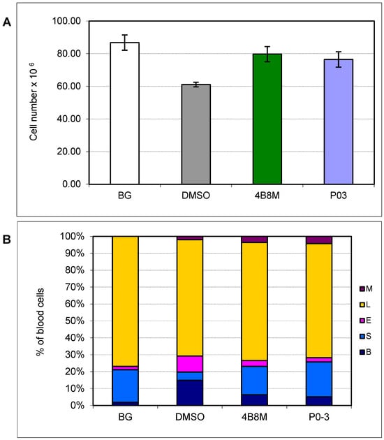 Effect of the P03 peptide on the number (A) and cell composition in peripheral blood (B) in a mouse model of dextran sulfate-induced nonspecific inflammation. P03 and 4B8M (as a reference compound) were applied to mice by gastric tube at a dose of 100 µg/mouse. The mice from the BG group only drank acidified water (without dextran sulfate) and were given the solvent (DMSO) per os (by a gastric tube). Control mice drank acidified water plus 3.5% dextran sulfate and were given only the solvent (DMSO) by gastric tube. (A) The mean values ± SE of the number of thymocytes are presented. Statistics: DMSO vs. 4B8M p = 0.0143, DMSO vs. P03 p = 0.0382 (ANOVA). (B) The mean values of the percentage of blood cells are presented. B—bands (precursor forms of neutrophils), S—segments (mature forms of neutrophils), E—eosinophils, L—lymphocytes, M—monocytes. Statistics: B: DMSO vs. 4B8M NS (p = 0.3828), DMSO vs. P03 p = 0.0111 (ANOVA of K-W); S: DMSO vs. 4B8M p = 0.0001, DMSO vs. P03 p = 0.0001 (ANOVA); E: DMSO vs. 4B8M NS (p = 0.2381), DMSO vs. P03 p = 0.0007 (ANOVA of K-W); L: DMSO vs. 4B8M NS (p = 0.9657), DMSO vs. P03 NS (p = 0.9927) (ANOVA); M: DMSO vs. 4B8M NS (p = 0.5438), DMSO vs. P03 NS (p = 0.0601) (ANOVA of K-W).