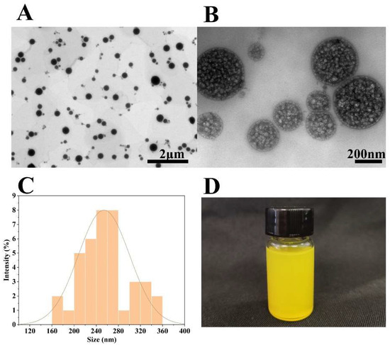(A,B) TEM image of Lip-Cur/Ba at different magnifications; (C) the size of Lip-Cur/Ba; (D) appearance of Lip-Cur/Ba.