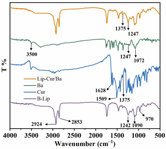 FT-IR spectroscopy is commonly used to analyze functional groups and structures in unknown substances. As shown in Figure 2, for the FT-IR spectroscopy of B-Lip, the absorption peaks at 2924 cm−1 and 2853 cm−1 are attributed to the stretching vibration of C-H in the low-end hydroxyl group of YL, the absorption peaks at 1242 cm−1 and 1090 cm−1 are attributed to the stretching vibration of the head group of Chol, PO2− and the absorption peak at 970 cm−1 is attributed to the stretching vibration of N+-CH3 [42]. For the FT-IR spectroscopy of Cur, the absorption peak at 1628 cm−1 is attributed to the mixed vibration of C=O and C=C, the absorption peak at 1509 cm−1 is attributed to the telescopic vibration of C-O and C-C, the absorption peak at 1427 cm−1 is attributed to the bending vibration of the olefinic structure C-H and the absorption peak at 1375 cm−1 is attributed to the telescopic vibration of the C-O-C of the aromatic ring [43]. For the FT-IR spectroscopy of Ba, the absorption peak at 3500 cm−1 is attributed to the stretching vibration of the intermolecular hydroxyl group of baicalein, the absorption peaks at 1600–1700 cm−1 are attributed to the C=C and benzene ring C-H stretching vibration, the absorption peak at 1247 cm−1 is attributed to the stretching vibration of the benzene ring C=C and the absorption peak at 1072 cm−1 is attributed to the stretching vibration of the C-O-C [44]. Compared with the profiles of the above three substances, the FT-IR spectroscopy of Lip-Cur/Ba retained the characteristic peaks at 1375 cm−1 belonging to Cur and 1247 cm−1 to Ba, which indicated that Cur and Ba were successfully encapsulated into liposomes.