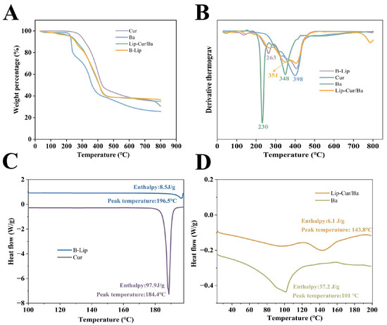 As shown in Figure 3A,B, the thermal decomposition of B-Lip is concentrated between 220 °C and 420 °C, and the mass loss within this temperature is due to the loss of choline groups within the EYL [45]. The thermal decomposition of Cur occurs mainly at 398 °C. There are two loss platforms for Ba, and its thermal decomposition occurs mainly at 230 °C and 348 °C. Lip-Cur/Ba occurs mainly at 351 °C due to the weight loss peaks that occur as a result of the combined action of Cur and Ba, and the combined effect of EYL [46]. This indicates that Cur and Ba were successfully encapsulated into liposomes.