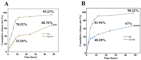 (A) Release behaviors of Lip-Cur and Cur (**: p < 0.01). (B) Release behaviors of Lip-Ba and Ba (***: p < 0.001).