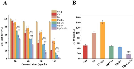 (A) Cell cytotoxicity of B-Lip, Cur, Ba, Cur/Ba, Lip-Cur, Lip-Ba and Lip-Cur/Ba. (B) IC50 of Cur, Ba, Cur/Ba, Lip-Cur, Lip-Ba and Lip-Cur/Ba (**: p < 0.01, ***: p < 0.001).