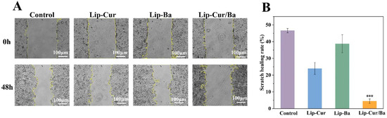 (A) Micrograph of the scratch experiments on A549 cells of Lip-Cur, Lip-Ba and Lip-Cur/Ba. (B) Scratch healing rate of Lip-Cur, Lip-Ba and Lip-Cur/Ba (***: p < 0.001).
