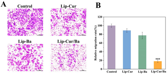 The Transwell chamber is divided into an upper chamber and a lower chamber with a polycarbonate membrane with small holes at the bottom of the upper chamber. Different culture solutions were added to the upper and lower chambers so that the effect of the components in the culture solution on cell movement and migration could be investigated. As shown in Figure 8A, the experimental group migrated significantly fewer cells into the lower chamber than the control group. The number of migrated cells was quantified using ImageJ. It can be found that the longitudinal migration rate of Lip-Cur/Ba was only 18.04%, which was significantly less (p < 0.001) than that of the Lip-Cur and Lip-Ba groups. Moreover, the migration rate of Lip-Cur/Ba was reduced by 82.06%, 79.53% and 76.62% compared with that of the control group, Lip-Cur group and Lip-Ba group (Figure 8B). This indicates that Lip-Cur/Ba can effectively inhibit the longitudinal migration of A549 and is more effective than single-carrier liposomes. Based on the above results, we can preliminarily deduce that Lip-Cur/Ba has a certain inhibitory effect on the migratory movement of A549 cells, and Lip-Cur/Ba has the best antimigration ability.