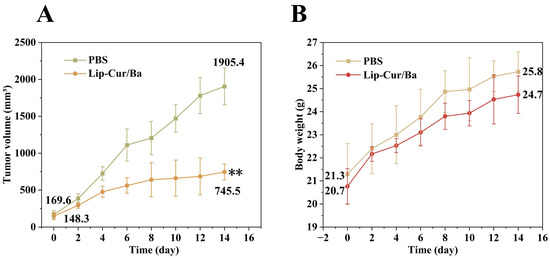 The antitumor activity of Lip-Cur/Ba was assessed by subcutaneous injection of A549 cells in BALB/c mice to form tumors to mimic the in vivo experimental setting. The results of in vitro experiments have demonstrated that Lip-Cur/Ba is significantly more potent than Lip-Cur and Lip-Ba in killing A549 cells, so the in vivo experiments mainly explored the antitumor activity of Lip-Cur/Ba. As shown in Figure 10A, which shows the change in tumor volume of each mouse, the tumors of control mice injected with PBS increased in volume over time, from only 169 mm3 on the first day at the start of the injections until the tumors had grown to 1905 mm3 on the 14th day at the end of the treatment, which is a more than 10-fold increase in volume. The tumor volume of Lip-Cur/Ba mice was 148 mm3 on the first day of the injections, and the subsequent growth rate was significantly inhibited, with a tumor volume of 745 mm3 at the end of 14 days, which was significantly smaller than that of the control group. After 14 days of treatment, the mice were terminated and the tumor tissues were stripped and weighed. The average mass of the tumors in the control group was 1629 g and that of the injected group was 485 g (Figure 10B), which proved that Lip-Cur/Ba had a certain inhibitory effect on the tumors. Moreover, the weight of the mice increased within 14 days of treatment, and there was no weight loss and other side effects, which proves the safety of Lip-Cur/Ba.