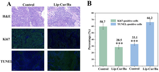 The expression of Ki67 marks the level of tumor cell proliferation, as shown in Figure 11A. The expression of green signals was stronger in the control group and weaker and less in Lip-Cur/Ba, which proved that the proliferation of tumor cells was inhibited after the injection of Lip-Cur/Ba in mice. This was further confirmed in the TUNEL assay, where there was little green signal in the control group, indicating less apoptosis, whereas a large area of green fluorescence expression could be observed in Lip-Cur/Ba, proving that apoptosis was greatly increased. By analyzing the percentage of positive cells (Figure 11B), it can be seen that the percentage of Ki67-positive cells in Lip-Cur/Ba (28.54%) was significantly smaller than that in the control group (59.68%), and the percentage of TUNEL-positive cells in Lip-Cur/Ba (66.21%) was about twice as high as that in the control group (33.09%). These above results consistently demonstrated the inhibitory effect of Lip-Cur/Ba on tumor cells in vivo.