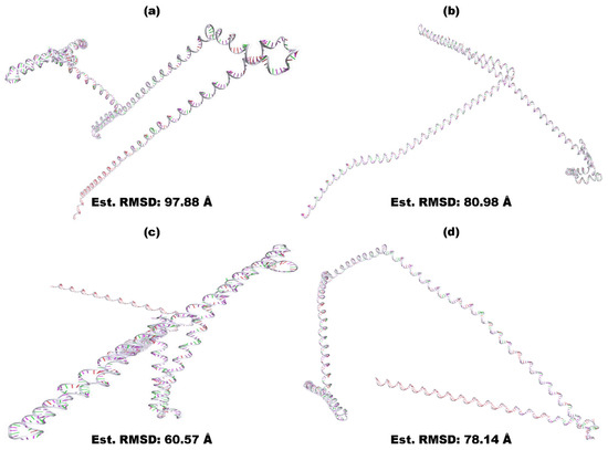 Predicted 3D structures of mRNA-derived vaccine candidates BGTV (a), CDPV (b), GMPV (c), and LDPV (d). Generated using trRosettaRNA.