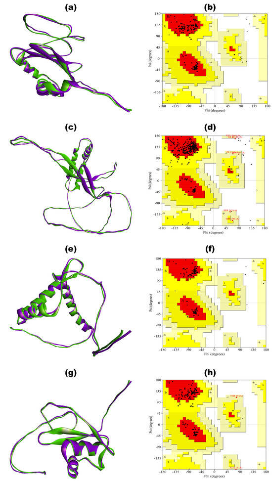 Superimposed 3D models of unrefined (purple) and refined (green) BGTV (a), CDPV (c), GMPV (e), and LDPV (g) with Ramachandran plots of refined 3D constructs of BGTV (b), CDPV (d), GMPV (f), and LDPV (h).