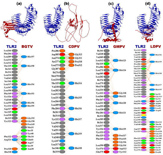The docking complexes involving TLR4 (BGTV, CDPV, GMPV, and LDPV) exhibit similar trends in interface residues, interface areas, dG values, and Kd values compared to their TLR2 counterparts. However, notable differences exist in the calculated binding affinities and intermolecular interactions. For example, LDPV-TLR4 demonstrates the highest binding affinity, with a dG of −20.4 kcal mol−1, and the lowest dissociation constant of 1.1 × 10−15 M. Salt bridges, hydrogen bonds, and non-bonded contacts also vary across the TLR4 complexes, reflecting unique interaction profiles within this receptor system (as shown in Figure 5 and Table 8).