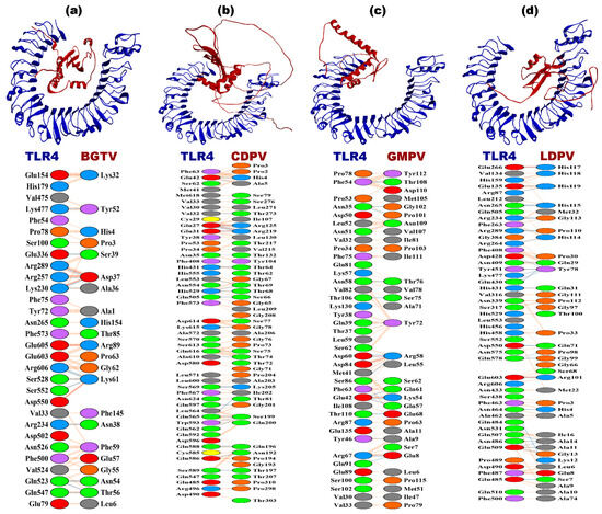 Docking complexes of vaccine candidates (red) against T. rubrum and TLR4 receptor (blue). (a) BGTV-TLR4; (b) CDPV-TLR4; (c) GMPV-TLR4; (d) LDPV-TLR4.