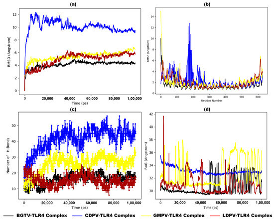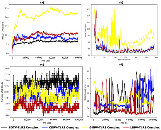 The docking complexes BGTV-TLR2, CDPV-TLR2, GMPV-TLR2, and LDPV-TLR2 exhibit distinct free energy changes (dG) for the binding range from −12.7 to −15.1 kcal mol−1, suggesting favorable binding energies across these complexes along with their dissociation constants (Kd) at the 25 °C span and indicating strong binding affinities (as shown in Table 8). Analyzing the binding affinity in terms of the lowest energy states, LDPV-TLR2 demonstrates the highest binding affinity, with energies of −1453.9 kcal mol−1. These binding affinities predominantly stem from electrostatic, hydrophobic, Van der Waals, and electrostatic interactions with salt bridges, hydrogen bonds, and non-bonded contacts that play significant roles in binding. For instance, CDPV-TLR2 forms the highest number of salt bridges (4), whereas BGTV-TLR2 forms the fewest (2). Regarding hydrogen bonds, LDPV-TLR2 forms the highest number (17), whereas BGTV-TLR4 forms the fewest (14). The number of non-bonded contacts ranges from 150 to 215, with LDPV-TLR2 demonstrating the highest count and BGTV-TLR4 the lowest (as shown in Figure 4 and Table 8).