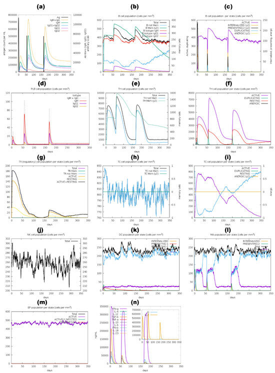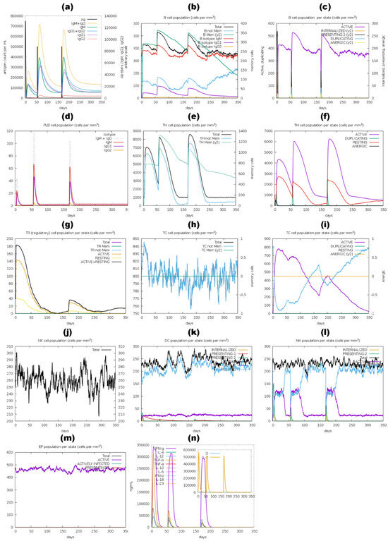The C-ImmSim (https://kraken.iac.rm.cnr.it/C-IMMSIM/, accessed on 2 April 2024) [128], an online antigen-based immune simulator, was utilized to evaluate the vaccine constructs with and without adjuvant for immunogenic profiles. This web server predicts immune reactions by hybridization, combining the position-specific scoring matrix (PSSM) with machine learning algorithms. Each vaccine received three doses of 1000 antigens, with an 8-week interval between doses. The doses were administered at time-steps 168 and 504 (equivalent to 8 h in real life), respectively, with the first dose given at time-step 1. The simulation was conducted for 1050 time-steps using default parameters.