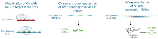 Regulatory non-coding RNAs, which control gene expression at the post-transcriptional level, are also used for OV modification. microRNAs (miRNAs) represent non-coding RNAs that regulate many important processes in different organisms. The relative abundance of miRNAs in cells can differ during tumorigenesis, and some miRNAs act as tumor stimulators or tumor suppressors [44]. These features are used for cancer therapy with OVs.