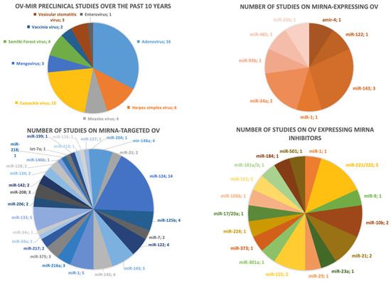 miRNA selection to target an OV depends on cancer type, the backbone virus, and the organs which should be protected. In recent research, certain miRNAs have been more often selected. These are miR-124-3p, which is abundant in the nervous system, miR-133, which is increased in skeletal and cardiac muscle tissues, miR-143, which is enriched in smooth muscles of blood vessels and internal organs, and miR-1, the expression of which is elevated in smooth, skeletal, and cardiac muscles (Supplementary Materials, Table S1).