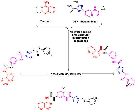 To substantiate our hypothesis in the current research, we strategically employed scaffold hopping and molecular hybridization methodologies for the design of novel molecules. These molecules were meticulously crafted as analogs (uredio, amide and schiff base), interlinking pyridopyrimidine and thiazole moieties via uredio and amide linkage with a central phenyl ring as a spacer. The unique molecular design is based on the fact that 2-[2-(cyclopropylcarbonylamino)pyridin-4-yl]-4-methoxy-1,3-thiazole-5-carboxamide and tacrine are the FDA-authorized drugs. However, our approach involved their modification to kindle a new class of compounds with the potential for dual selectivity towards GSK-3β and BuChE. The structures of the designed molecules are portrayed in Figure 2.
