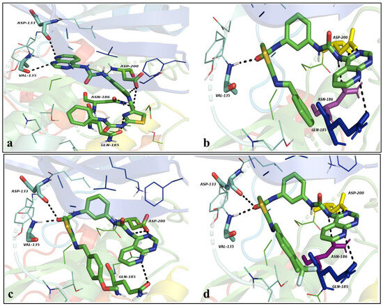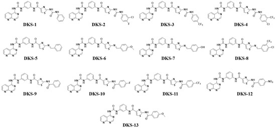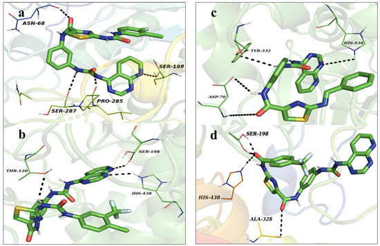 Molecules DKS-5 and -11, with corresponding docking energies of −12.1 and −11.7 kcal.mol−1, resided in the active site of the protein by producing numerous interactions. The -NH of the amide generated hydrogen bond contacts with His438, and the two nitrogens of the urea group established three hydrogen bond interactions with Asp70 and Tyr332. Moreover, the phenyl, central phenyl, and the thiazole rings developed π-π staking and π-alkyl hydrophobic interactions with Trp231, Phe329, Gly439, Trp82, Ala328, and Leu286. Similarly, both amide functional groups of the 11 engendered polar hydrogen bond contacts with Ser198, His438, and Ala328. Furthermore, the pyridopyrimidine, thiazole, and trifluoromethyl phenyl groups developed π-π staking and π-alkyl hydrophobic contacts with Gly116, Trp82, and Ala277, as shown in Figure 7c,d.