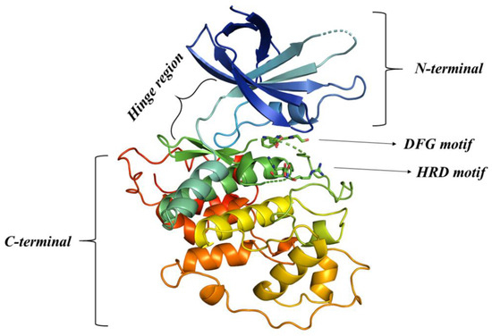 Protein GSK-3β belongs to the category of serine threonine kinases. Its X-Ray crystal structure (PDB ID: 4PTC) was utilized for the purpose of molecular docking. The crystal structure of GSK-3β comprises four essential segments: the N-terminal, C-terminal, hinge region, and activation loop [15]. The upper segment of the structure consists of antiparallel β strands, forming a small component of the protein. This region, known as the N-terminal (Lys36-Leu132), is stabilized by intermolecular hydrogen bonding. The larger part of the structure is composed of a spiral α-helix referred to as the C-terminal (Val139-His831) [16]. Connecting these two terminals is the hinge region (Asp133-Thr138), which extends further into the flexible region known as the activation loop. The activation loop is comprised of two critical motifs: DFG (Asp200, Phe201, and Gly202) and HRD (His179, Arg180, and Asp181). These motifs play a pivotal role in determining the specificity of inhibitors [17]. The region between the N-terminal and C-terminal constitutes the active site. This is where ATP binds, involving the N- and C-terminals, hinge region, and the DFG motif, as depicted in Figure 3.