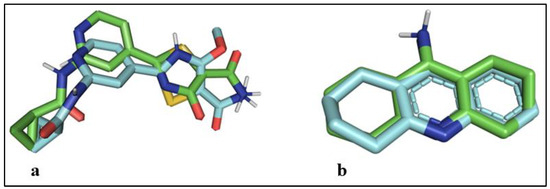 Coinciding poses of the co-crystallized ligands: (a) docked conformation of 2WE in cyan with co-crystallized ligand in green, RMSD: 0.98 Å; (b) docked conformation of THA (Tacrine) in cyan with co-crystallized ligand in green, RMSD: 0.5 Å.