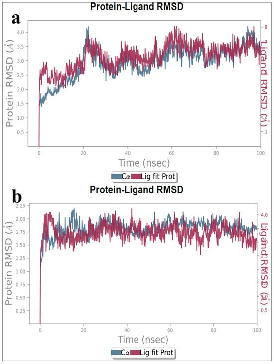 GSK-3β RMSD was noted from 2.5 Å at the initial time point, and an upsurge of 1.5 Å in the graph was noticed at 22 ns. Again, an exponential decrease in the spike was observed from 23 to 38 ns of approximately 2.3 Å, a further increase and decrease in spikes was observed until 80 ns, and a platonic phase was noticed from 81 to 95 ns at 2.9 Å and was finally equilibrated to 3.5 Å at 100 ns, as depicted in Figure 8a. Though there is an increase and decrease in the graph during the end of the time point (100 ns), the graph is observed to be stable. This indicates that the protein–ligand interactions are quite stable and can be considered for further study. Moreover, in the RMSD of BuChE, initially the value was observed from 1.75 Å and a spike was observed to 2.25 Å at 20 ns. A constant decrease and increase in the spikes were noted from 21 to 80 ns at 2 Å and finally equilibrated at 2 Å until the end of 100 ns MD duration, as depicted in Figure 8b. The protein–ligand complexes (GSK-3β-DSK1 and BuChE-DSK4) revealed a conformational stability of ligands in the active site of the protein based on the plot analysis; this analysis thus indicates a good protein–ligand interaction.