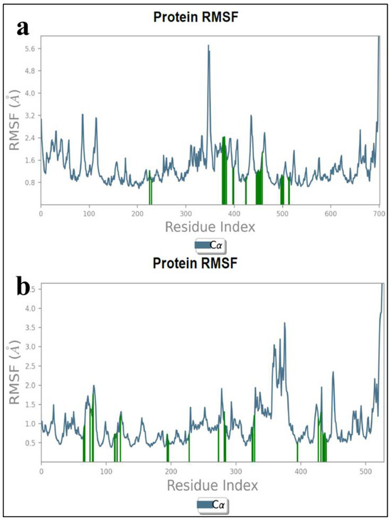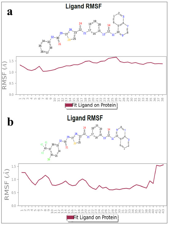 In the protein RMSF plot, minimal fluctuations were noticed for DKS1 and for DKS4, and it revealed some higher fluctuations for atom number 8 (aromatic carbon of pyridopyrimidine) and 41–43 (-F atoms of CF3) in the overall of dynamics study, as shown in Figure 10a,b.