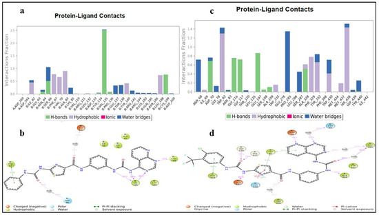 One vital aspect in assessing the solidity of the protein–ligand complex is the analysis of the interactions of amid ligands and amino acids within the protein’s active site. These interactions engross various types, including hydrophobic, electrostatic, hydrogen bond, ionic, and water bridge polar interactions. Scrutiny of protein–ligand interactions showed that ionic, hydrophobic interactions contributed with an optimal percentile and the water bridging interactions contributed with a higher percentile. In the due course of the MD analysis, the DKS1 with GSK-3β demonstrated water bridging polar contacts with Ser66 (44%) and Glu137 (33%); four hydrogen bond interactions were observed with Val135 (66, 89, and 99%) and Cys199 (72%) and hydrophobic π-π staking contacts with Phe67, as stated in Figure 11a,b. DSK4 with BuChE revealed five polar hydrogen bond contacts with Gly116 (74%), 117 (72%), Asp70 (58%), Glu197 (86%), and Ala328 (50%); hydrophobic and electrostatic contacts with Trp82 (82%, π-π staking) and Phe329 (60%, π-π staking); and π-cation interaction with His438 (95%). The maximum number of water bridging interaction were spotted with Pro285 (43; 90%), Asn68 (62%), and Trp430 (30%), as portrayed in Figure 11c,d.